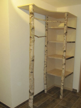 Diese Garderobe wurde basierend auf einer Kundenzeichnung gefertigt. Sie besteht aus Birken-Massivholz. Die Rinde (bestehend aus Borke, Bast und Kambium) wurde aus ästhetischen Gründen teilweise mitverarbeitet. Ein besonderes Highlight sind die als Ganzes verwendeten Stämme.