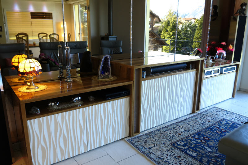 Dieser Salontisch enthält eine versenkbare Bar ohne Elektronik. Somit sind keine evtl. störenden Kabel zu sehen.