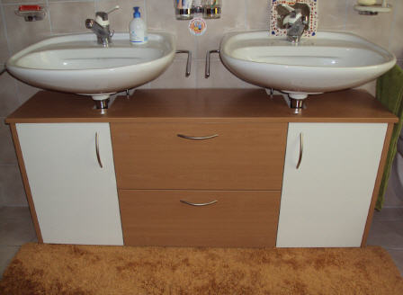Einige unserer Badmöbel werden aus beschichteten Decor-Platten hergestellt. Weisse Türchen können beispielsweise als aufweckender Kontrast zur Holzimitation wirken. Die Platzverhältnisse werden optimal genutzt, die problematischen Wasserleitungen verdeckt.