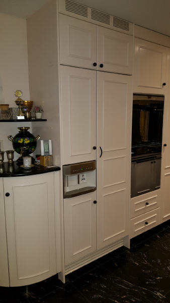 Bei dieser bestehenden Küche wurde das Food-Center mit einem Regal, einem Oberschrank, einem Kühlschrank mit Doppel, Lüftungsgitter und einem Weinkühler ersetzt.