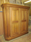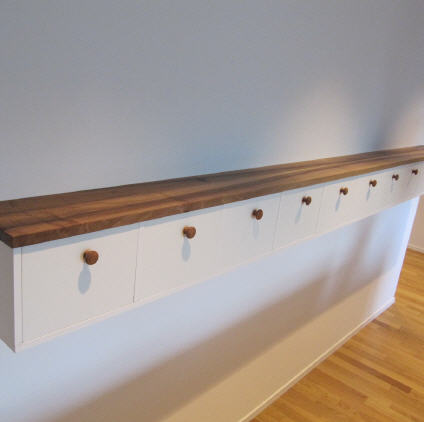 Dieses Fernsehmöbel ist auf spezielle Wünsche massgeschreinert. Das Nussbaumfurnier wurde zusammen mit den Kunden ausgewählt. Die Oberflächenbehandlung erfolgte in feinstem Hochglanz. Das Herzstück ist der eintauchbare Fernseher. Er besitzt eine Sicherheitsabschaltung, damit er im Möbel nicht weiterläuft und überhitzt. Die Bedienung erfolgt via Fernsteuerung oder iPhone. Nebst den Leuchtnischen sorgen die eingelassenen LED-Bänder für die gewünschte Stimmung. Die verschieden einstellbaren Farben reflektieren sich auf den weissen Relieftürchen.