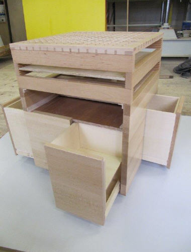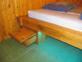 Ein anderer Auszubildender hat in seiner IPA ein Bett mit LED-Beleuchtung hergestellt. Dazu gehören ebenfalls zwei Nachttischchen, die entweder frei im Raum oder unter dem Bett platziert werden können.