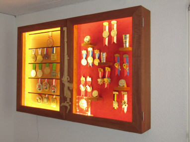 Ein Auszubildender hat in seiner IPA (individuelle praktische Arbeit) eine Vitrine für Medaillen und Pokale hergestellt. Das zu sehende Gewehr hat er ebenfalls selbst aus Linde geschnitzt.